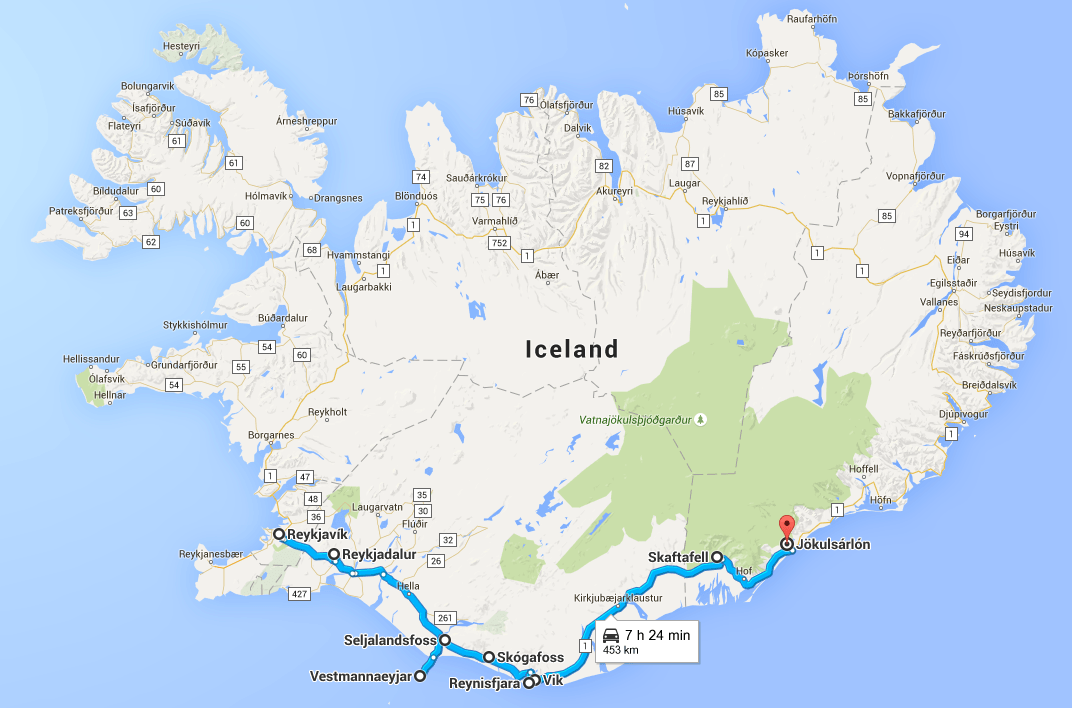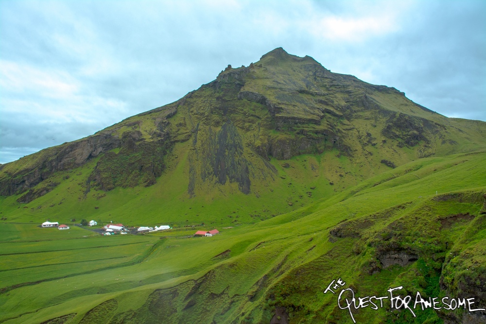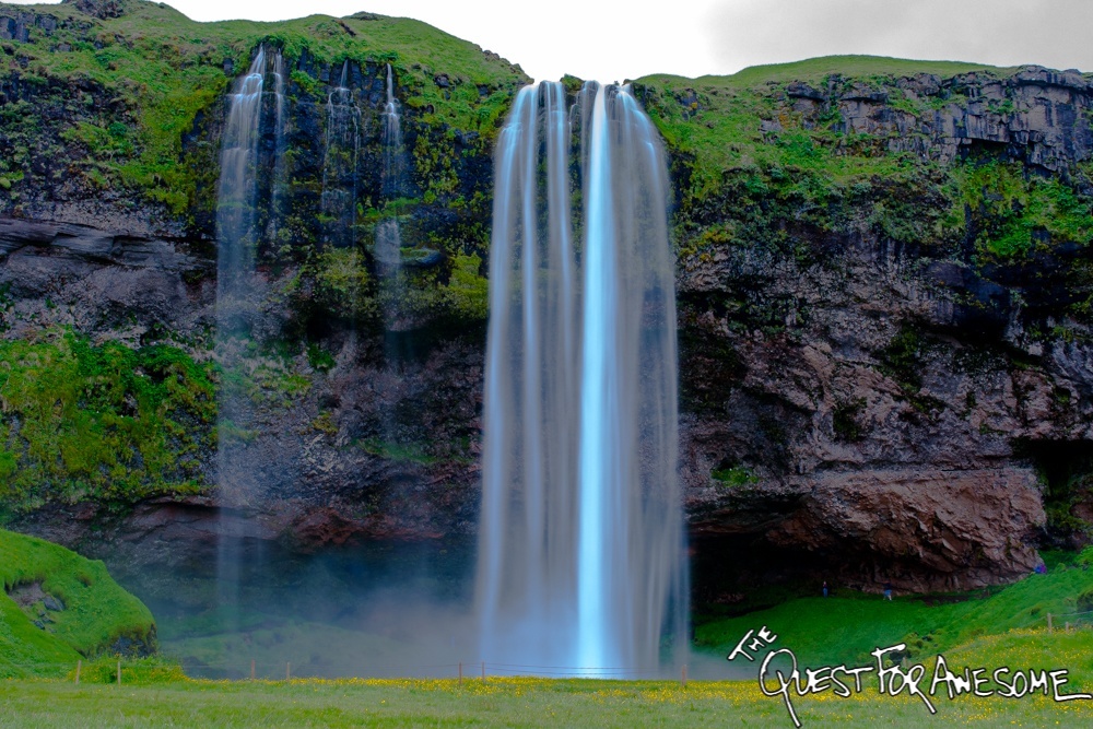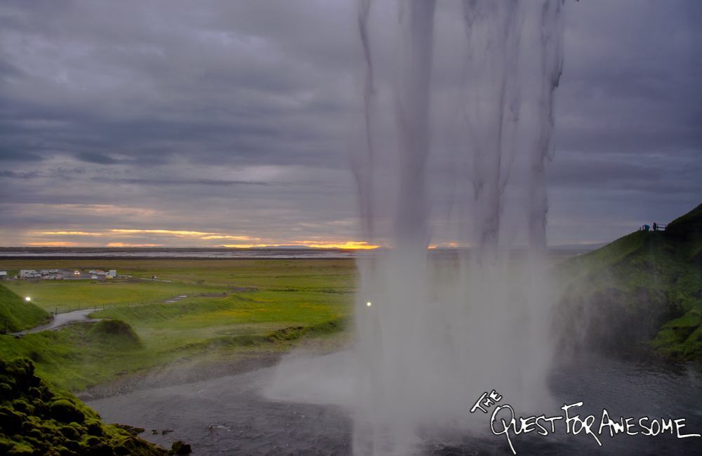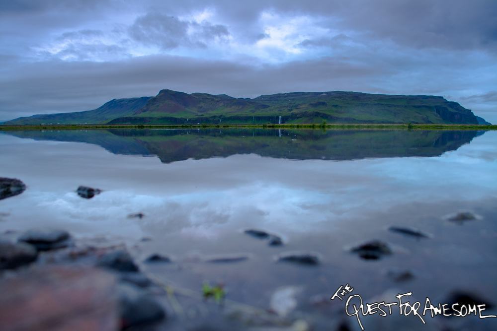 Seljalandsfoss from afar, reflected in a pond off the side of the road ...